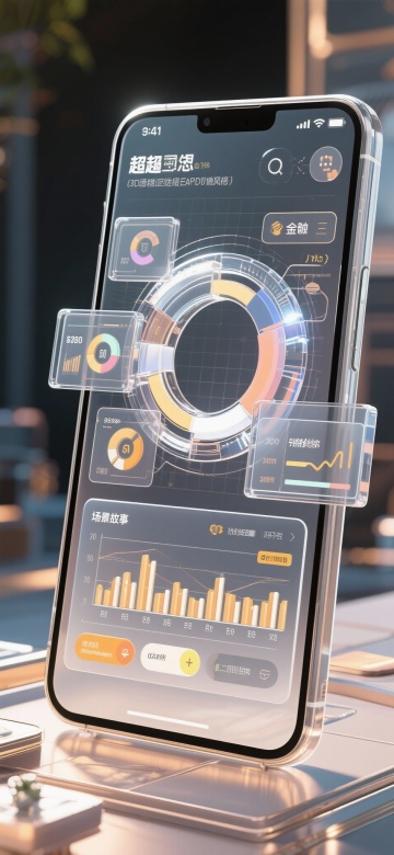 未来感科技界面,3D玻璃风设计,悬浮透明面板环绕中央主屏,粒子光效流动,虚拟现实交互体验,清透蓝调视觉。