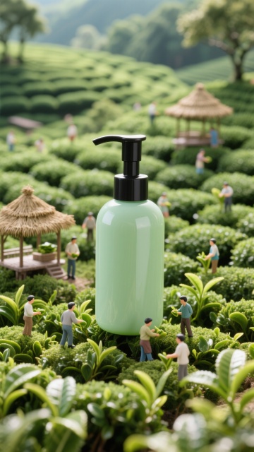 画面中心是一瓶带有黑色按压泵头的浅绿色沐浴露。背景是大片翠绿的茶园,点缀着茅草亭,许多人在茶园中活动,营造出自然、清新且富有生机的氛围,突出产品的天然草本属性。