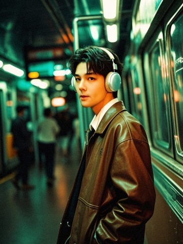 时尚潮流city pop风,霓虹灯下都市夜景,耳机青年尽显前卫个性。