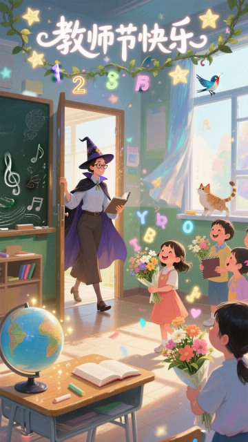 一个天空和教室交融的梦幻画面,一个烫着卷发的女教师站在画面中间分割画面,她面朝左侧的天空画面,右手在胸前搂着一本书,左手投掷出一个纸飞机,每个纸飞机上都坐着一个捧着鲜花的学生,学生穿着学士服一脸的笑容,天空飘着漂亮的气球,白云组成了“教师节快乐”字样。女教师身后是教室场景,温暖的阳光照进教室,照在桌子上,照在学生的身上,学生们都一脸憧憬的看着看着老师,面带笑容。超清画质,丰富的细节,创意感强烈,画面冲击力强烈,CG画质,教师节氛围。