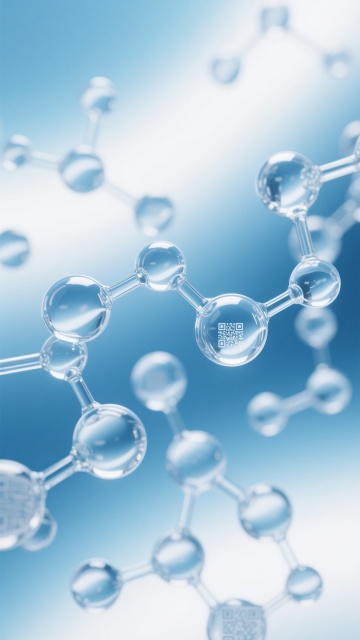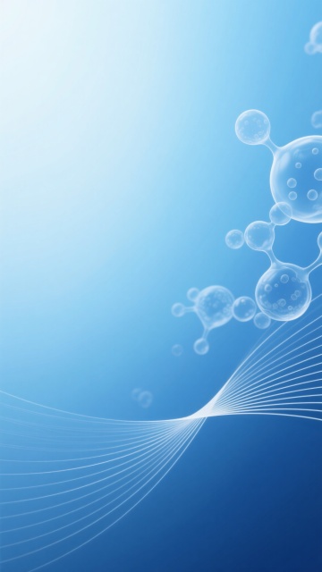 浅蓝色渐变背景,顶部至底部由浅至深的平滑过渡,营造出宁静、科技感与专业的氛围。画面中包含多个半透明的蓝色分子结构,由大小不一的球体通过线条连接组成,球体具有高光和阴影效果,呈现出3D立体质感,部分分子结构位于画面底部,球体颜色较深且立体感更强,部分位于顶部,颜色较浅且透明度更高。白色的DNA双螺旋结构以线条勾勒,贯穿于分子结构之间,其中一条主要的DNA链位于画面下方,与深色分子结构交织,另一条较细的DNA链位于画面上方,与浅色分子结构相伴。整体构图简洁大方,留白充足,视觉元素分布均衡,呈现出科学、医学、生物科技相关的专业设计感。