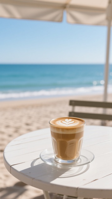 一杯装有精美树叶形状拉花的拿铁咖啡,置于透明玻璃杯中,杯子放在编织纹理的棕色杯垫上,背景改为阳光明媚的户外露台,摆放着简约的木质桌椅,周围有绿色植物点缀,整体保持高清写实风格,柔和的自然光从侧面照射,形成清晰的光影层次和温暖的色调,营造出悠闲惬意的氛围。