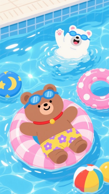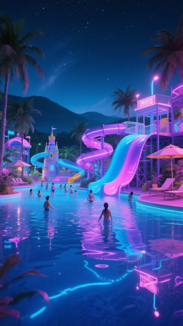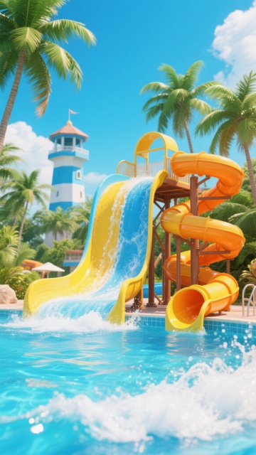 一幅充满活力的水上乐园插画,采用明亮活泼的卡通风格,以绿色、黄色、蓝色为主色调,整体色彩明快和谐。画面中分布着多个水上娱乐设施,包括蜿蜒的红色螺旋滑梯、大型的黄色水桶瀑布、橙色的直线滑梯,还有漂浮着鸭子造型游泳圈的蓝色水池。众多戴着泳帽的黄色小鸭子们在乐园中尽情游玩,有的从滑梯上欢快滑下,有的在水中嬉戏,有的躺在岸边的遮阳伞下休息。背景是茂密的绿色松树和棕榈树,营造出热带乐园的氛围,整体构图丰富饱满,充满童趣和夏日气息,线条圆润流畅,细节精致可爱,光影柔和,展现出一个热闹欢乐的水上乐园场景。