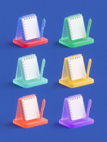 6个不同造型的签到元素系列素材集合,保持3D渲染风格、透明渐变质感、柔和光影和简约构图,每个元素均包含带线圈的白色横线笔记本、配套笔和底座,整体色彩分别为蓝色、红色、绿色、黄色、紫色、橙色,纯色背景,规整排布,展现统一设计感与系列多样性。