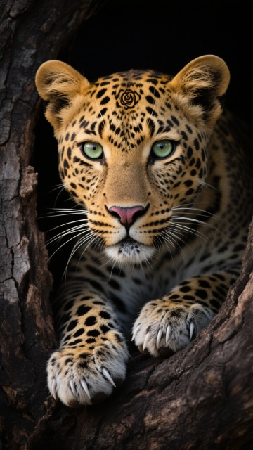 一张极致写实风格的豹子肖像照片,画面主体是一只成年豹子的正面特写,它的头部和前爪从粗壮开裂的深色树干洞口探出。豹子拥有金黄色的毛皮底色,覆盖着清晰锐利的黑色玫瑰花形斑点,面部斑纹对称分布,鼻梁呈浅棕色,鼻头为深粉色。它的眼睛是明亮的浅绿色,眼神专注而警觉,瞳孔呈圆形,眼白极少。耳朵竖立,内侧覆盖着细密的浅色绒毛,胡须洁白修长且根根分明。前爪的肉垫厚实,黑色斑点延伸至爪尖,露出部分锋利的白色爪子。树干纹理粗糙,呈现深褐色到黑色的渐变,表面有明显的裂纹和树结,质感坚硬。背景为纯黑色,形成强烈的明暗对比,突出豹子主体,营造出神秘而野性的氛围。光线从斜上方柔和打在豹子面部和前爪,形成自然的高光和阴影过渡,增强面部立体感和毛发的丝绒质感,整体画面聚焦于豹子的神态与细节,传递出力量与优雅并存的原始美感。