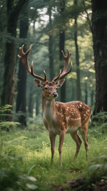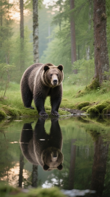一只成年非洲象站在浅水塘中,长长的象鼻伸入水中溅起细小水花,象牙洁白修长,皮肤布满深邃纹理,巨大的耳朵自然垂落。背景是茂密的绿色非洲丛林,左侧有高大的树木和枯树枝干,右侧是低矮的灌木丛,地面覆盖着棕黄色的泥土。天空呈现清澈的蔚蓝色,光线明亮柔和,营造出宁静自然的野生动物栖息地氛围,水面倒映出大象的身影和周围的绿色植被,整体画面具有高度写实的摄影质感,细节丰富,色彩饱满和谐。