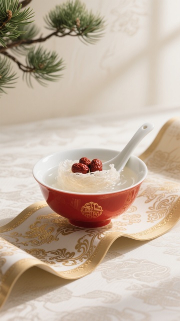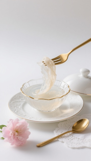 一张展示四种不同养生类食品的系列素材集合海报,采用简约纯净的白色纯色背景,保持与原图一致的高清写实摄影风格,柔和明亮的顶光照明,突出食材的细腻质感与通透光泽。画面被等分为四个规整排布的象限,每个象限中均有一个带有金色描边的白色瓷碗作为容器:左上角碗中盛放着晶莹剔透的桃胶,搭配一双金色小镊子正夹起一块;右上角碗里是饱满圆润的皂角米,旁边点缀着几颗干桂圆;左下角展示的是浸泡后舒展的雪燕,用金色勺子轻轻搅动;右下角则为炖煮好的银耳莲子羹,表面漂浮着几粒枸杞。整体色调以白色和食材本身的自然色泽为主,金色元素作为点缀统一贯穿,营造出高端、纯净、健康的视觉氛围,信息传达清晰直观,符合养生食品的目标受众审美,四个元素既独立又形成和谐统一的系列感。