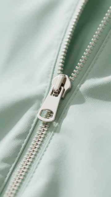 简约现代风格的金属拉链特写,银色金属拉头与齿状链牙,拉链呈V字形向上延伸,拉头位于画面底部中央,拉链齿排列整齐,金属表面有细腻的光泽感与轻微的渐变过渡,背景为纯白色,整体构图简洁,突出拉链的结构美感与工业设计感,无任何文字或装饰元素,视觉焦点集中在拉链的金属质感与几何形态上。