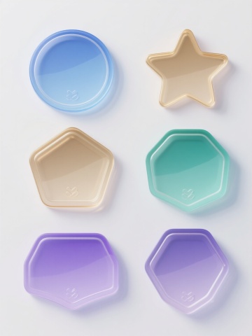 白色背景上,六个不同配色、不同样式的形状排列整齐,每个形状都具有柔和渐变的色彩过渡效果,边缘呈现出轻微的模糊晕染质感,整体保持简洁、现代的设计风格,色彩鲜明且和谐统一,视觉层次清晰,信息传达直接高效。