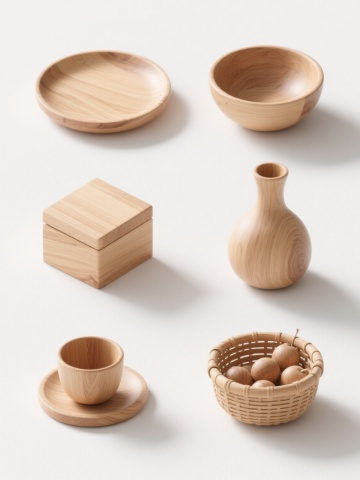 六个不同形态的原木家居用品(包含木碗、木盘、木盒、木杯垫、木花瓶、木果篮),每个物品均展现清晰的浅色橡木纹理,表面光滑有自然光泽,采用3D渲染风格,置于纯白色纯色背景上,整体呈现简约、现代、北欧的设计感,六个物品呈规整网格状排布,彼此间距均匀,光线从左上方柔和照射,投射出浅淡自然的阴影,强调木质的温润质感与细腻肌理。