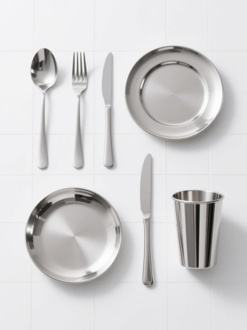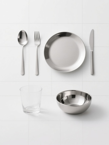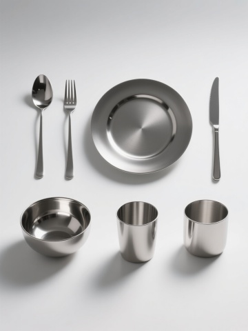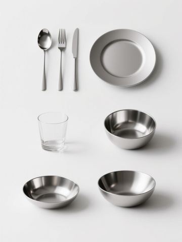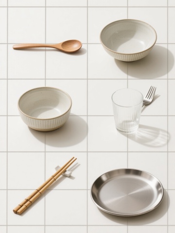 简约现代风格静物摄影,六个不同种类的餐具(如木质汤匙、陶瓷餐盘、金属刀叉、玻璃水杯、竹制筷架、搪瓷碗)以规整网格状排布,每件餐具保留原木、陶瓷、金属等材质的自然纹理与细腻质感,柔和侧光营造轻微阴影增强立体感,统一采用纯白色纯色背景,无任何文字、logo及水印,整体构图平衡对称,视觉层级清晰,突出餐具本身的形态美与材质对比,符合现代简约设计美学。