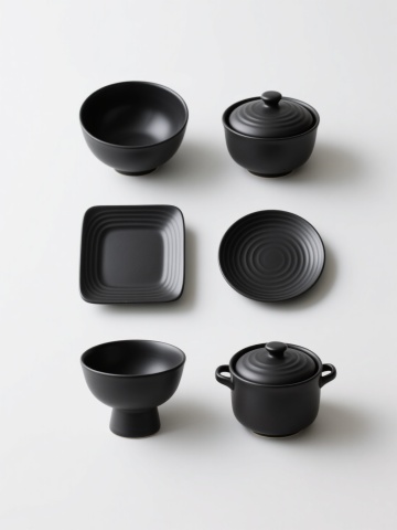六个完全不同的黑色陶瓷餐具,包括深口碗、浅盘、带盖汤碗、方形餐碟、高脚碗和双耳炖盅,每个餐具都具有与原图一致的光滑釉面质感、同心圆环状凹纹装饰和哑光黑色调,以2x3网格形式规整排布在纯白色背景上,保持相同的45度角俯视角、清晰的边缘轮廓和柔和的阴影效果,整体呈现简约、统一的产品展示风格。