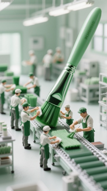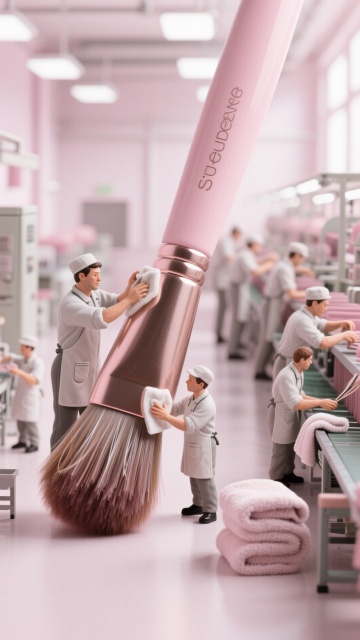 美妆微缩工厂 整体粉白色调。车间里,一群流水线员工在制作一支巨大的美妆刷,有的在修剪刷毛,有的在擦拭,有的在梳刷毛,有的在洗毛巾;环境明亮干简洁。