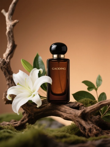 奢华感与中式美学交融,重拟物风瓶身搭配金属浮雕细节,静谧森境中绽放白莲,极繁主义自然元素衬托优雅实景氛围。