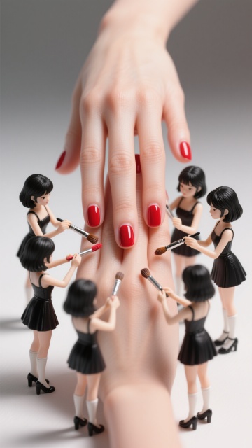 超写实人像摄影,柔和自然光从左上方照射,形成细腻的明暗过渡和柔和阴影,浅米色背景,女性侧脸特写,精致五官,闭着双眼,唇色为自然裸粉色,面部点缀银色小亮片、立体粉色花瓣和白色小花装饰,发丝优雅盘起,耳边垂落粉色花瓣装饰;手部轻托下巴,全新美甲设计采用深邃酒红色渐变底色,指尖镶嵌不规则切割的黑色水钻与银色金属链条装饰,搭配哑光质感黑色蝴蝶结立体甲片;整体妆造变换为冷艳暗黑系风格,眼妆以深棕与墨黑色眼影晕染出深邃烟熏效果,眼尾点缀细小黑色羽毛,唇妆改为哑光正红色,面部保留少量银色亮片但增加黑色小珍珠点缀,营造神秘优雅的暗黑氛围,画面保持高清细腻的皮肤质感和柔和的光影层次,色彩对比增强,突出冷艳与精致的视觉冲击。