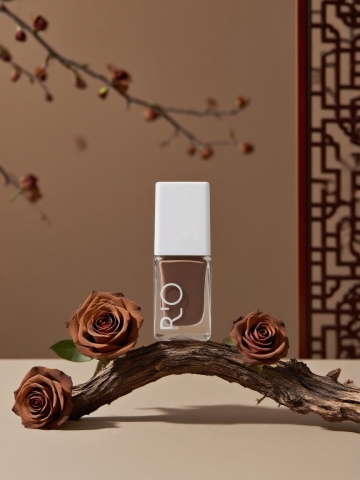 抠出主体,保留主体形状和颜色。前景是主体置于古朴枯树枝上。几朵棕色玫瑰花点缀枯枝。后景有树枝花朵点缀,背景是棕色墙面和中式屏风花窗。景深效果。