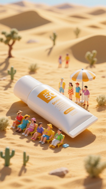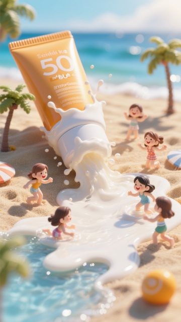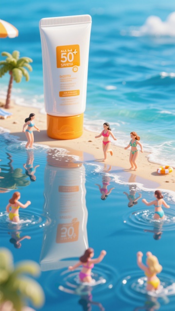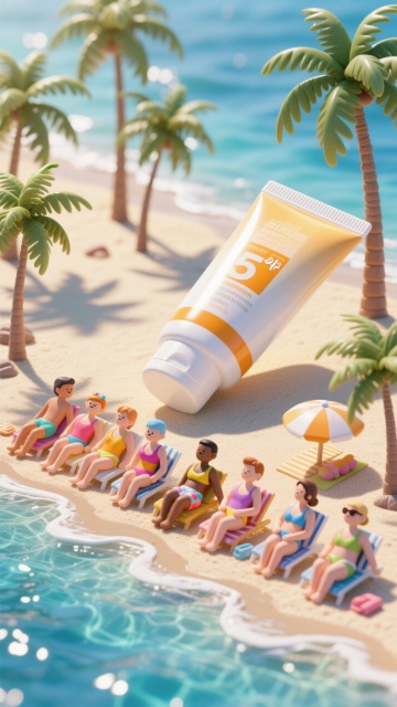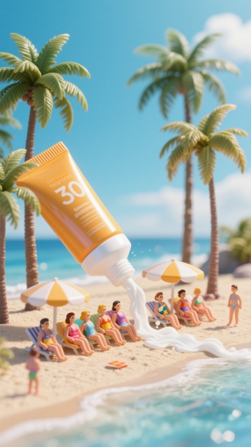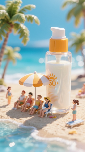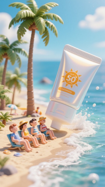 3D微缩艺术风,清新清爽感,防晒霜与沙滩小景,夏日度假氛围。