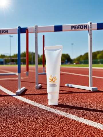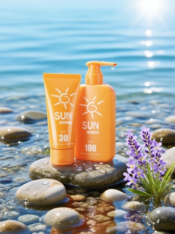 清新自然背景,简约现代设计,橙色防晒霜突显活力与保护。