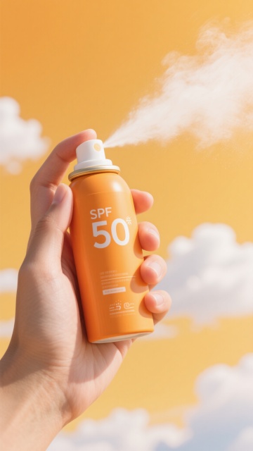 一只手握着一瓶防晒霜喷雾,喷雾正从瓶口喷出,形成白色的雾状。整体画面采用温暖的橙色和黄色作为主色调,背景是明亮的橙黄色天空,点缀着少量白色云朵。防晒霜瓶身主体为柔和的暖橙色,瓶身上有白色的“SPF 50”字样和相关标识,喷雾的白色与瓶身及背景的暖色调形成鲜明对比,营造出温暖、活力的夏日氛围。光线明亮柔和,从斜上方照射,在手和瓶身上形成淡淡的阴影,增强立体感。