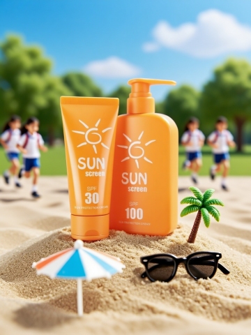 现代3D轻拟物风设计,金属质感瓶身,沙滩背景突显清爽夏日防晒创意。