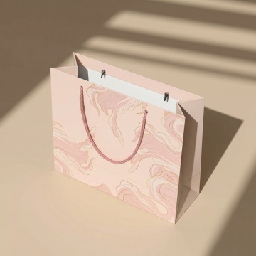 极简主义风格的棕色牛皮纸袋,配有自然色绳制手提带,袋子表面有细腻的压纹图案,整体呈现出干净利落的立体剪裁,柔和的侧光照射在袋身形成自然的明暗过渡,阴影简洁地投射在纯白色背景上,展现出简约而富有质感的静物美学。