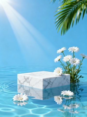 夏日场景,清澈碧蓝的海水占据画面下方,波光粼粼,水面反射着阳光形成明亮的光斑。海水上方是广阔的天空,左侧有一束耀眼的阳光从云层间隙斜射而下,天空中漂浮着蓬松的白色云朵,右侧和左上角有几片翠绿的棕榈叶自然垂落,增添夏日氛围。画面视觉中心是一个位于水面上的展台,展台为圆形,底部是透明的玻璃材质,顶部是带有自然纹理的白色大理石台面,整体呈现出简洁、现代且通透的质感,与夏日海滨环境和谐融合,整体风格为清新、明亮、具有高光泽度的3D渲染效果,光影柔和,色彩以蓝白绿为主色调,营造出宁静而清爽的夏日氛围。
