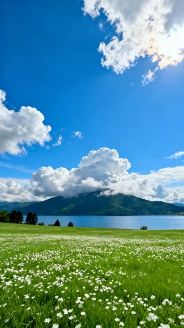写实风格的自然风景画面,画面下方前景是茂盛的花丛,包含大量白色和粉色的花朵,花瓣层次分明,搭配翠绿的叶片,充满生机;背景是广阔的蓝色湖面,湖面平静,倒映着天空的色彩,远处可见朦胧的山脉轮廓;天空占据画面上半部分,呈现清澈的蓝色,点缀着形态各异的白色云朵,云朵边缘柔和,光影过渡自然;整体色彩明亮清新,光影效果为自然的天光,光线柔和,营造出宁静、开阔、舒适的氛围,构图采用前景花丛与背景湖天一色相结合的方式,层次分明,视野开阔。