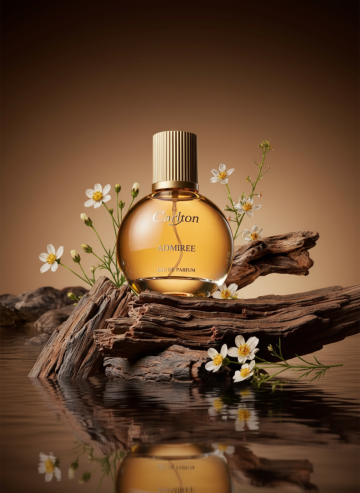 优雅奢华的香水瓶置于木雕风底座,搭配柔和插画风花卉,简约主义设计,尽显高贵。