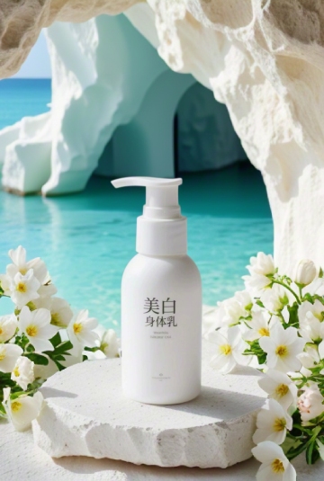 产品放在白色海盐石洞内,石洞外是海洋,白色花朵点缀