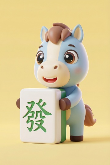 软3D风格的卡通小马,拟人化设计,手持“发”字麻将牌,充满可爱与喜庆感,节日氛围浓厚。