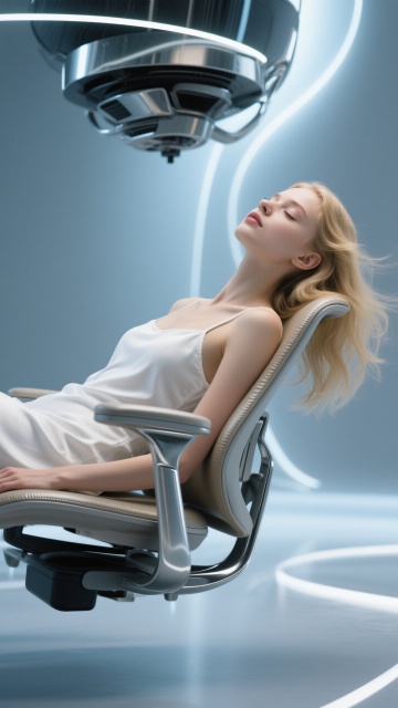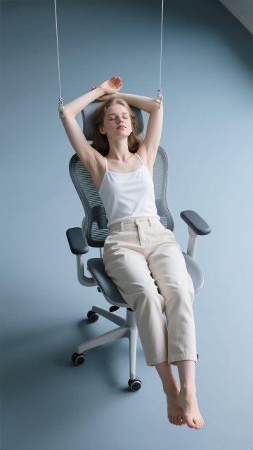 提示词 外国女生,侧躺,人体工学椅,悬空,横屏,看得见整个人,能看见椅子和人的脚,双手向脑后举起来