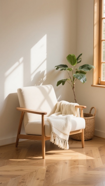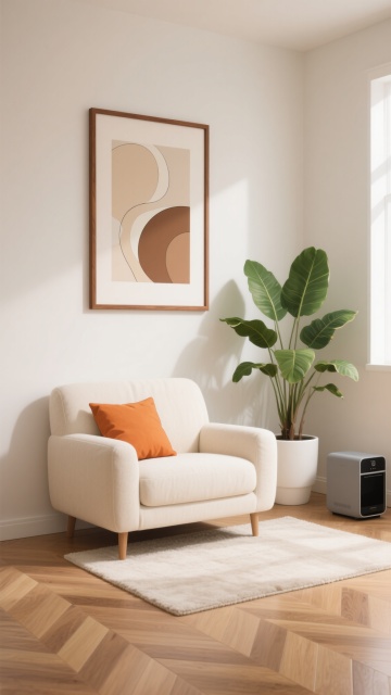 动漫风格插画,明亮自然光从左侧照射,米白色墙面,墙上挂着棕色木质相框的抽象装饰画,画中是米色和棕色的柔和曲线,下方是米白色布艺单人沙发,沙发上放着一个橙色靠垫,沙发左侧有一盆大型绿植,叶片宽大翠绿,放置在白色花盆中,沙发右侧地面上有一个灰色和黑色相间的小型家用电器,浅色地毯铺在人字形拼花木地板上,整体画面温馨舒适,色彩柔和,线条流畅,细节精致,构图平衡。