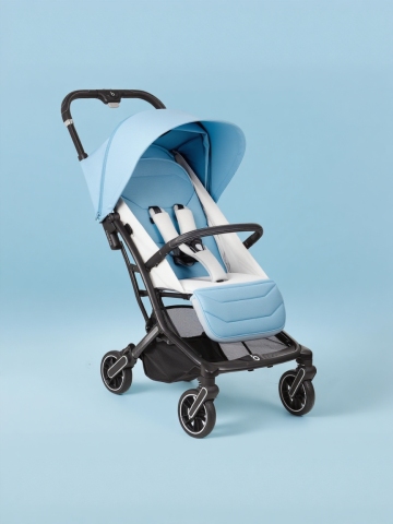 外国年轻妈妈,胸前抱着宝宝躺在可调节的沙发椅上闭眼休息,沙发椅靠背放平,身体可以平躺,双腿伸直,脚穿白色袜子,光线明亮,正面