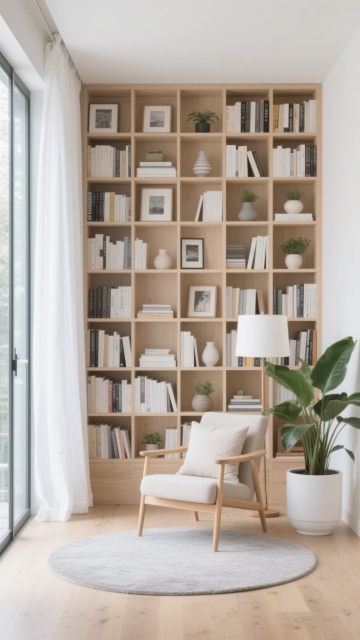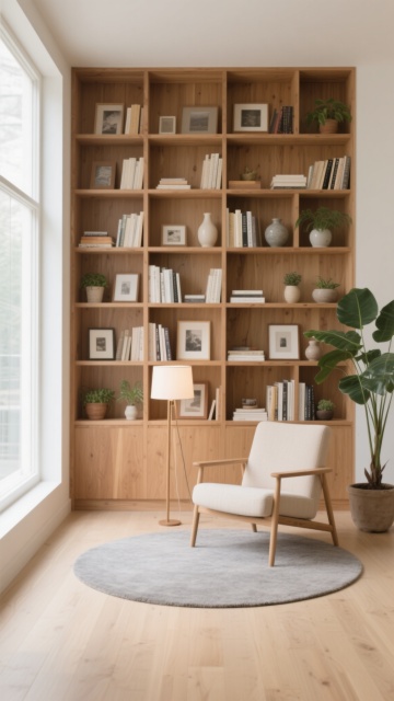 极简主义风格卧室室内设计,从不同角度展现的房间摆设,柔和的浅木色与纯净白色为主的配色方案,阳光透过白色纱帘洒在浅色木地板上形成温暖光影,简约木质床搭配白色床品,床头柜上摆放绿植花瓶与书籍,房间角落有大型绿植点缀,整体空间明亮通透、整洁有序,具有自然清新的氛围和舒适的居住感。