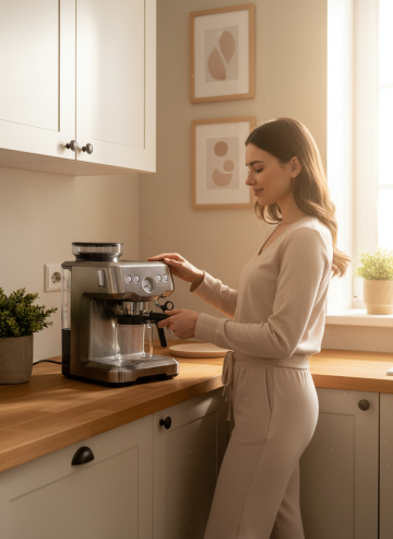 温暖晨光中的厨房场景,轻拟物风搭配简约主义设计,柔和色调与面料质感营造温馨舒适氛围,实景感十足,传递居家生活的宁静与惬意。