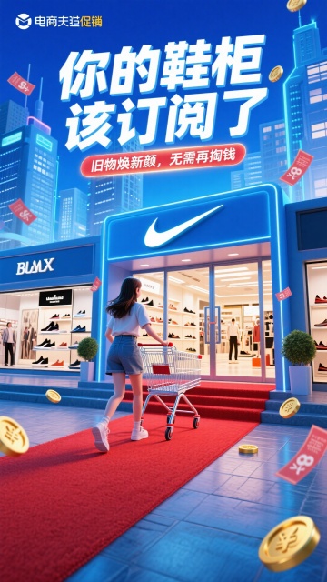 顶部大标题“你的鞋柜该订阅了”和副标题“旧物焕新颜,无需再掏钱”。背景以城市为底版,醒目的位置一个门店入口,门店入口铺着红毯,一个穿着休闲装的女孩,推着空购物车,准备进入门店,走在红毯上,冲击抬头角度,商场,周围飘着优惠券和金币,红毯两旁是品牌鞋店,3d风格,电商大促、科技感,蓝色调