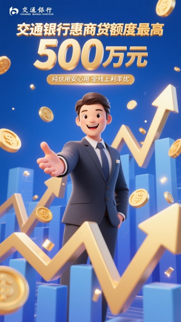 商务感3D角色风设计,展现金融增长趋势,金币与图表元素突出贷款优势。