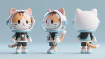 3D卡通风格,蓝色小猫拟人化设计,毛发生长细腻,可爱感十足。