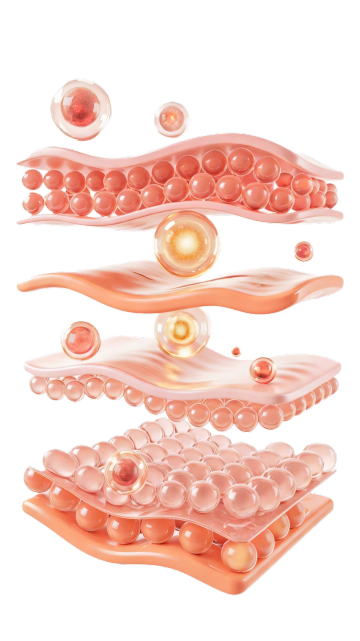 3D渲染风格的皮肤保湿科技概念图,纯净浅蓝色渐变背景,前景是半透明质感的浅粉色皮肤表层,皮肤下方是多层排列整齐、充满水分的透明蓝色细胞结构,细胞表面有细腻的光泽和反光效果,多个透明的蓝色分子结构漂浮在皮肤上方,分子由大小不一的球体通过纤细的连接管组成,整体光影柔和,光线从上方照射形成轻微的高光和阴影,营造出清新、水润、科技感十足的氛围,突出皮肤的水润饱满与深层保湿的科技原理,画面构图层次分明,主体突出,视觉效果通透纯净。