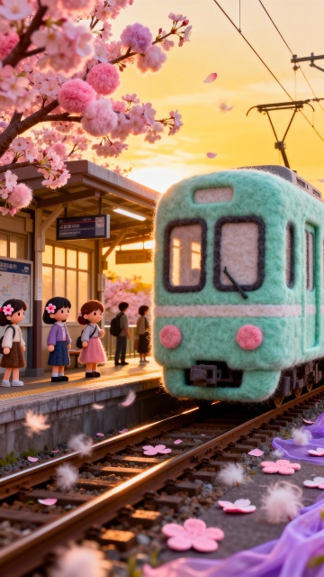 日本风景,高清摄影,大师级作品,画面中央一列绿色的复古电车行驶在铁轨上,铁轨两旁是盛开的粉色樱花树,樱花花瓣飘落,背景是连绵的雪山和蓝天白云,阳光明媚,光影清晰,色彩鲜艳,构图采用三分法,前景樱花虚化,中景电车清晰,远景雪山壮丽,整体氛围清新唯美,充满春日气息。