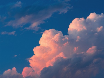 傍晚时分的天空,深邃的蓝色天幕上点缀着被夕阳染成橘粉色边缘的蓬松白云,云层纹理清晰可见,光线柔和地从云层间隙洒落,营造出宁静而温暖的氛围,高清晰度的摄影质感,自然的光影过渡,真实的云彩形态与层次。