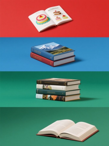 一张设计精美的书籍主题系列海报,高分辨率3D渲染,超写实材质表现与细腻光影效果,柔和漫射光源从左上方照射,书籍边缘形成清晰高光与自然阴影过渡,整体画面干净通透。纯色背景(如深蓝/墨绿/赭石/明黄/浅灰/酒红),中央区域网格布局整齐排列6个带白色边框的书籍组合元素:1. 红色书脊打开硬壳精装词典叠放三本不同花纹封面平装书,内页文字清晰;2. 五本黑色皮质封面烫金书名经典文学著作竖排堆叠,最上方斜放翻开笔记;3. 三本印象派画作局部封面艺术画册,一本翻开展示色彩丰富油画作品;4. 麻绳捆绑复古牛皮纸封面书籍,顶部放置金属圆框眼镜;5. 四本不同语言版本同主题彩色软质封面书籍呈阶梯状排列,最上层打开露出书签;6. 深蓝色封面配银色线条装饰硬壳精装科学图鉴叠放打开的植物标本集。所有元素保持统一3D写实风格与相似光影处理,元素间距均匀,视觉层级清晰,信息传达高效,具知识文化类宣传品设计感。