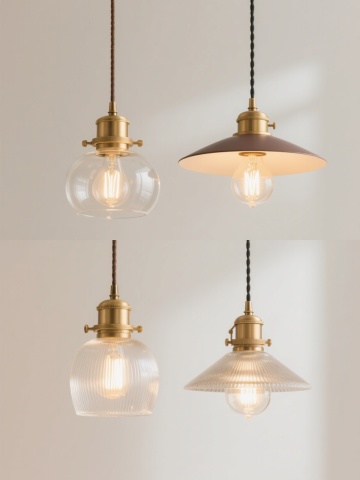 一组4个不同配色、不同样式、不同材质的现代简约风格吊灯造型,符合现实逻辑,上下两行对齐排列,浅色背景。第一个吊灯为黑色哑光金属材质,半球形灯罩,银色金属吊杆和底座;第二个吊灯为白色磨砂玻璃材质,圆柱形灯罩,金色金属支架;第三个吊灯为原木色实木材质,多角形灯罩,黑色金属配件;第四个吊灯为灰色布艺材质,锥形灯罩,银色金属支架。每个吊灯都有精细的材质纹理和光影效果,整体构图平衡,视觉层次分明,适合用于产品展示海报。