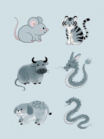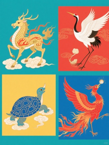 四个不同纯色背景的中国传统祥瑞动物插画组成的系列素材集合,规整排布成2x2网格。每个动物均采用相同的传统工笔手绘风格,线条细腻流畅,轮廓勾勒清晰,内部填充均匀平滑的色彩,装饰有云纹、卷草纹等传统纹样,动态飘逸灵动,姿态优雅舒展。第一个为青色背景上的金色麒麟,鹿角马头,身披火焰纹飘带,脚踏祥云;第二个为朱红色背景上的白色仙鹤,长颈展翅,尾羽修长,喙衔灵芝,周围环绕如意纹;第三个为明黄色背景上的蓝色神龟,背覆八卦图案,四肢生有祥云,头部有独角;第四个为靛蓝色背景上的赤色凤凰,羽翼华丽,尾部分叉如火焰,口吐宝珠,周身有流光效果。所有元素保持相同的视觉重量和细节复杂度,整体风格统一,色彩对比鲜明且和谐,形成具有浓厚中国传统文化韵味的系列装饰图案。