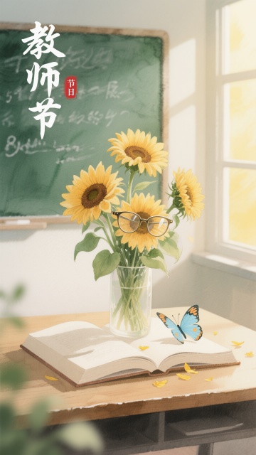 水彩风插画,清新文艺,向日葵与眼镜点缀,书页上的蝴蝶轻舞,教师节温馨氛围。