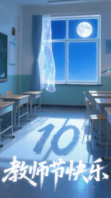 梦幻插画风教室,虚拟现实月光洒落,节日氛围浓厚。