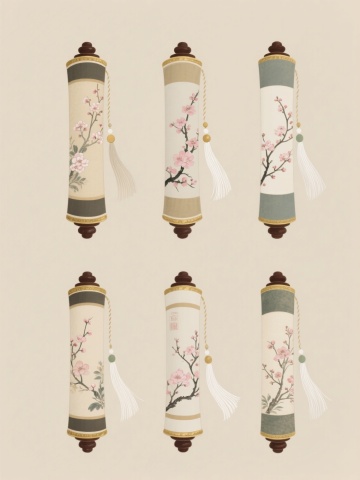 六个不同样式的中国传统扇子系列素材集合,规整排布在纯色背景上,每个扇子保持传统扇面结构但造型各异:有的扇骨呈流线型弧度,有的为几何棱角状,有的扇面边缘有波浪纹装饰,有的整体呈椭圆形,有的带有不对称剪裁设计,有的扇骨末端有流苏装饰;色彩上每个扇子整体色调完全不同,包括水墨黑白色调配金色勾边、青绿色渐变配银色花纹、靛蓝色底纹配红色点缀、粉紫色系晕染效果、橙黄色明亮色系、墨绿色复古色调;每个扇面都有不同的传统花纹内容,有的是山水写意画,有的是花鸟工笔画,有的是吉祥云纹图案,有的是书法文字,有的是传统戏曲人物,有的是缠枝莲纹样;所有扇子都具有类似原图的浮雕质感和光泽感,保持平面化设计风格,整体排列整齐有序,形成一个视觉统一又各具特色的系列素材集合。