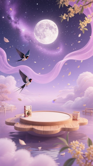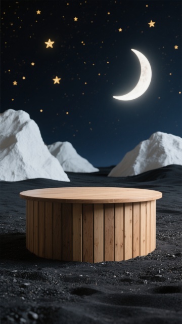 3D渲染风格的展台场景,主色调为深邃墨蓝与神秘紫,搭配点缀的金色光芒,整体呈现出夜晚星空下的梦幻氛围。画面采用低角度仰拍构图,光源来自上方模拟的星空,光线柔和地洒在场景中,形成细腻的高光与深邃的阴影对比。前景中央是一个圆形木质展台,展台由横向排列的浅色木板拼接而成,表面光滑,边缘整齐。展台后方是起伏的白色岩石地貌,岩石表面有自然的纹理和层次感,如同被月光照亮的雪山。天空部分是深邃的墨蓝色,点缀着闪烁的金色星星和淡淡的紫色星云,营造出宁静而神秘的宇宙空间感。画面中需包含几罐设计简约的奶粉罐,放置在木质展台上,奶粉罐以白色为主色调,搭配金色或紫色的品牌标识,与整体环境色调相呼应。整体设计注重光影的层次感和材质的细腻表现,木质展台的温暖质感与背景星空的冷色调形成对比又和谐统一,营造出高端、纯净且富有梦幻色彩的展示氛围。