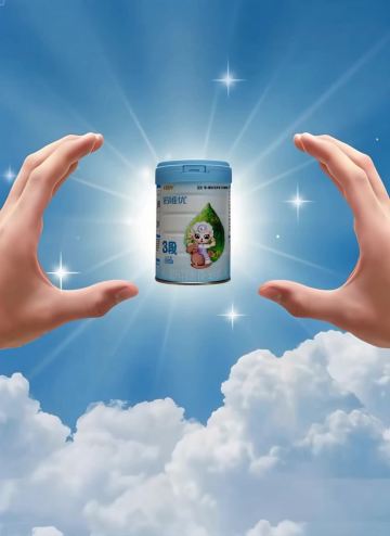 梦幻天空背景,3D软塑风格罐装奶粉悬浮于双手之间,卡通羊形象萌趣可爱,光影闪耀,营造虚拟现实般的纯净梦幻感。
