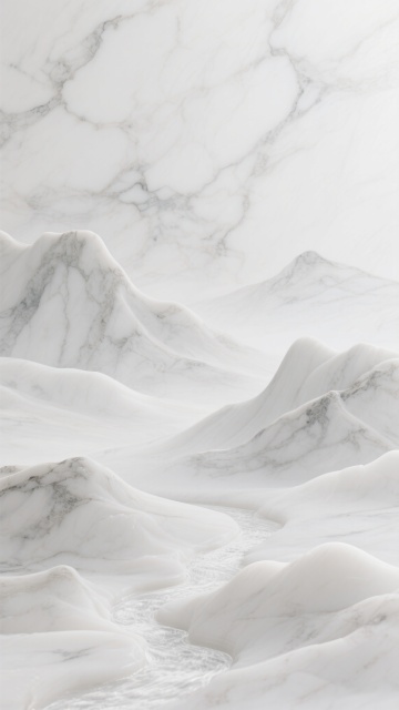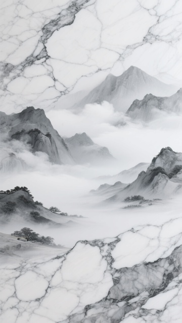 超高清白色大理石纹理背景,自然流畅的灰色纹理脉络巧妙勾勒出山峦起伏、层叠峰峦的山水风光意象,纹理走向如行云流水般自然,兼具大理石的细腻质感与山水意境的悠远空灵,整体风格简约大气,留白恰到好处,营造出宁静雅致的东方美学氛围。